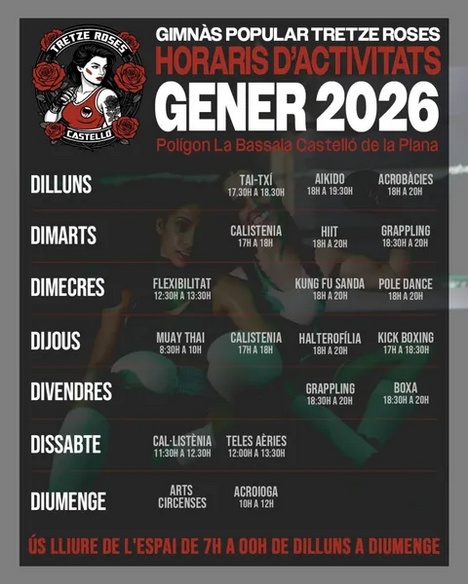 Ja tenim preparats els horaris d’activitats esportives del proper mes: Kick Boxing, Muay Thai, Pole Dance, HIIT (Entrenament d’Alta Intensitat), Boxa, Grappling, Cal·listènia, Arts Circenses, Acrobàcies, Tai-Txi, Aikido, Acroioga, Teles Aèries. I aquest gener augmentem les disciplines amb classes guiades de flexibilitat, mobilitat i estiraments.
