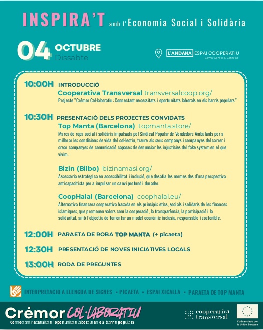 Des de la Cooperativa Transversal vos convidem a les jornades “Inspira’t amb l’Economia Social i Solidà ria”, en el marc del projecte Crémor Col·laboratiu: connectant necessitats i oportunitats laborals en els barris populars.